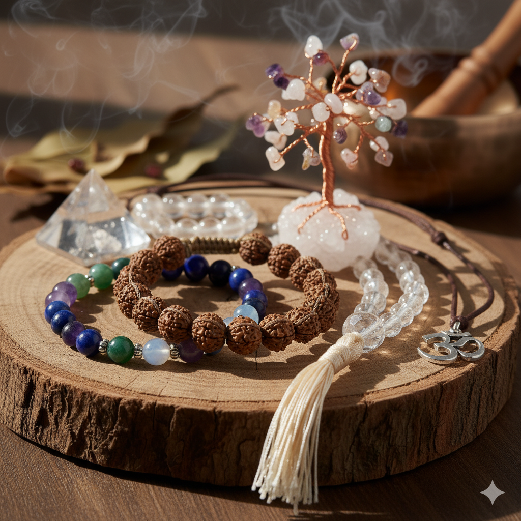 Gemstone, Rudraksha, and Crystal Bracelets combine beauty, energy, and spirituality. Rudraksha brings peace, gemstones attract prosperity, and crystals enhance healing vibrations. Wear them to elevate your aura and invite positivity into your life.