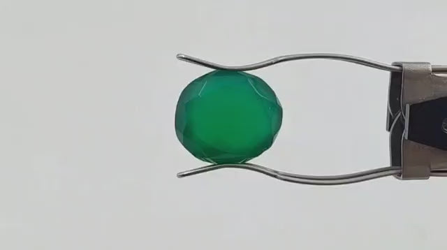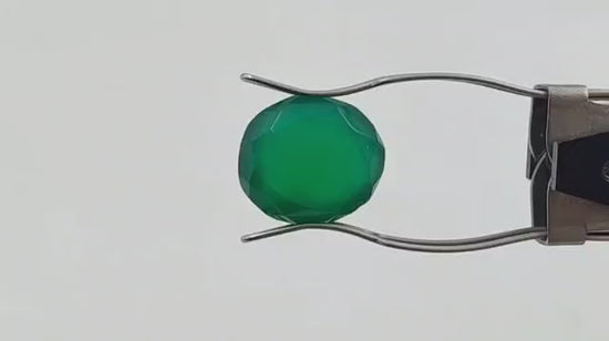 Genuine Green Onyx, a type of dyed chalcedony, is identified by its smooth, consistent green color, waxy luster, and its semi-translucent quality when held to light.